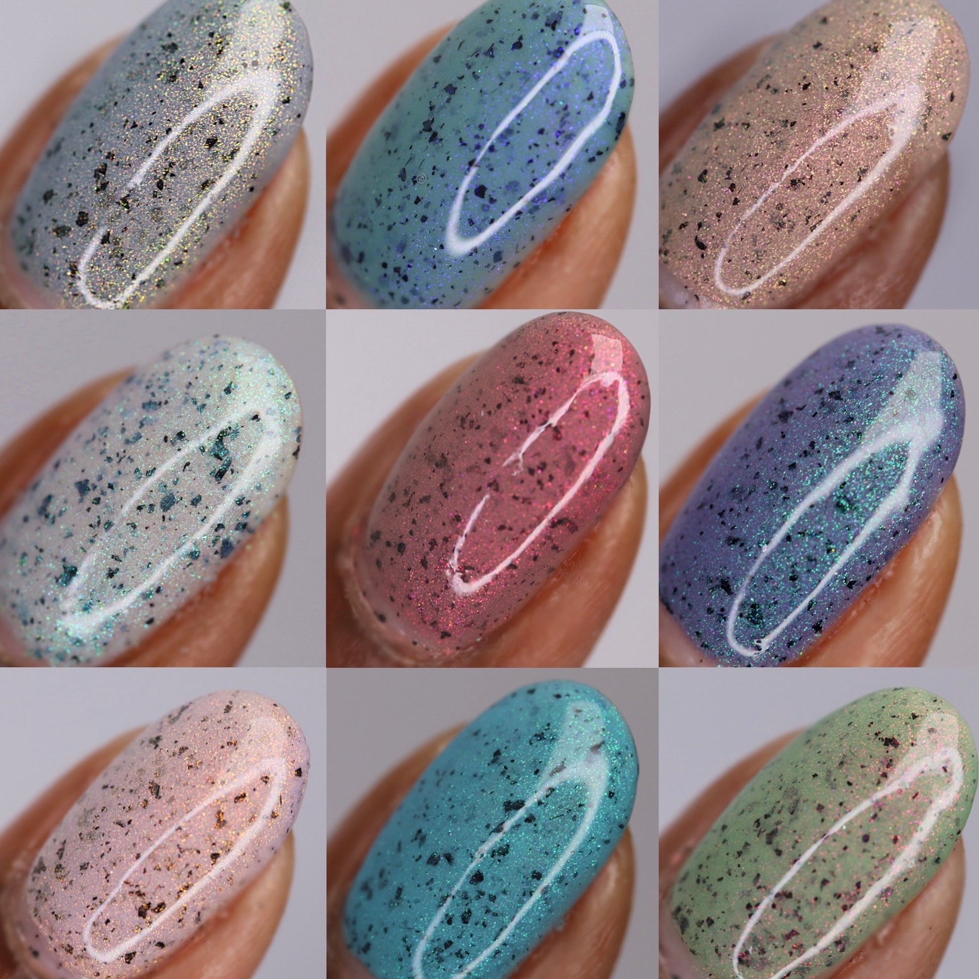 Please Note: These nail polishes contain flakies or glitter and will dry with a slightly textured finish they require 1-2 coats of Glossy top coat for a smooth finish.